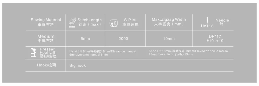 Adopt the large hook to reduce times that changebobbin (40% more bobbin capacity than standardhook).Two or three-point zigzag supply more powerto make stitching more beautiful.