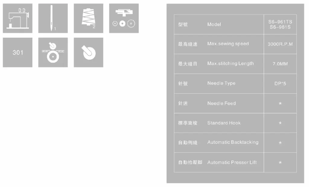 • Option:automatic thread trimming function.Onlyabout 3 mm thread tail after trimming.