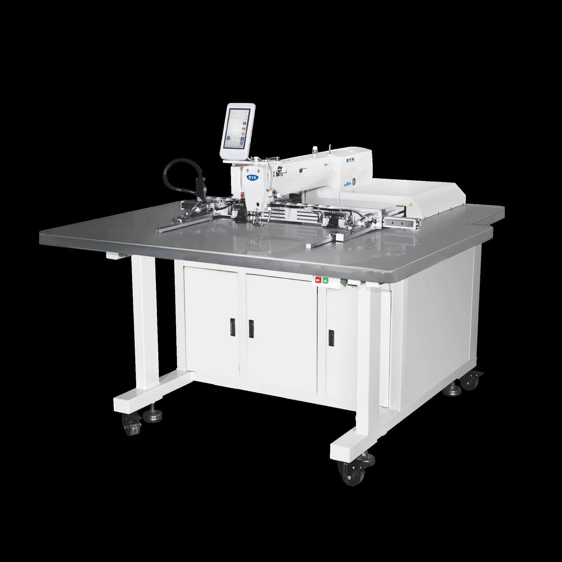 High-speed and stable sewing quality. Equipped with a high-rigidity feeding mechanism, it ensures precise needle positioning even during high-speed sewing, delivering neat thread trimming, consistent stitch length, and no pattern deviation even when sewing heavy materials. Boasting a large sewing area of 600×400mm, the spacious workspace enables versatile sewing applications: it can simultaneously finish combined sewing of multiple small parts for footwear and apparel, as well as large-size items such as leather bags, automotive interiors and airbags.
